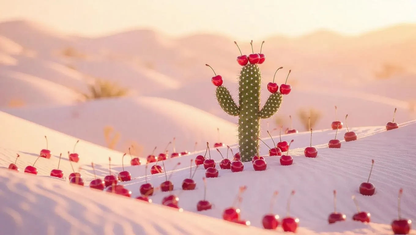 A whimsical desert of powdered sugar dunes, with a lone cactus adorned with vibrant red cherries, casting soft shadows in the golden hour light, creating a surreal and enchanting landscape