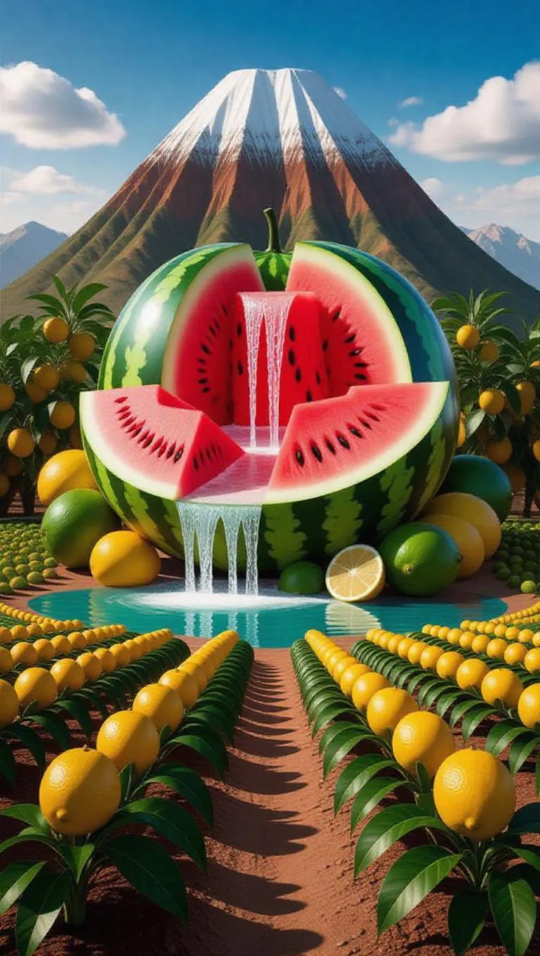 A mountain carved from a giant watermelon, with tangy watermelon-lime juice cascading down its peak, surrounded by mango orchards and lemon fields.