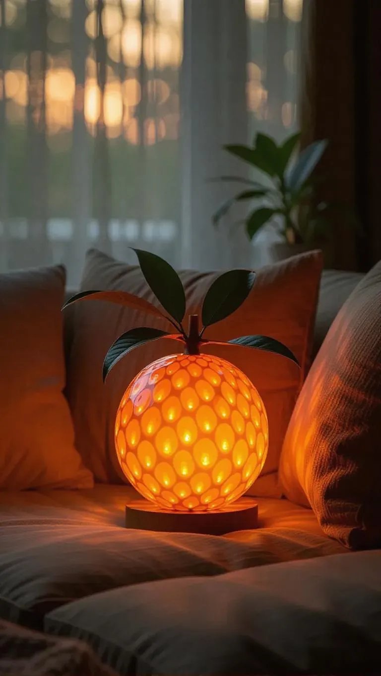 A whimsical lamp shaped like a glowing lychee, casting a warm, ambient light in an intimate corner, surrounded by plush cushions and soft textiles, creating a serene and inviting atmosphere.