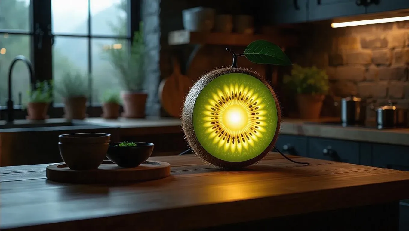 A whimsical lamp shaped like a glowing kiwi, casting a dim, ambient light in a moody kitchen, surrounded by dark wooden countertops and heavy textiles, creating a mysterious and intriguing atmosphere.