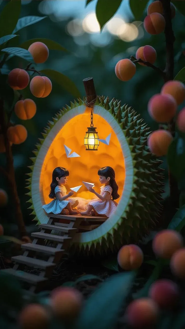 A cozy cabin crafted from a halved durian, nestled among vibrant peachtree bushes. Inside, a girl plays with paper airplanes, the warm glow of a small lantern casting a gentle light, creating a serene and enchanting atmosphere.