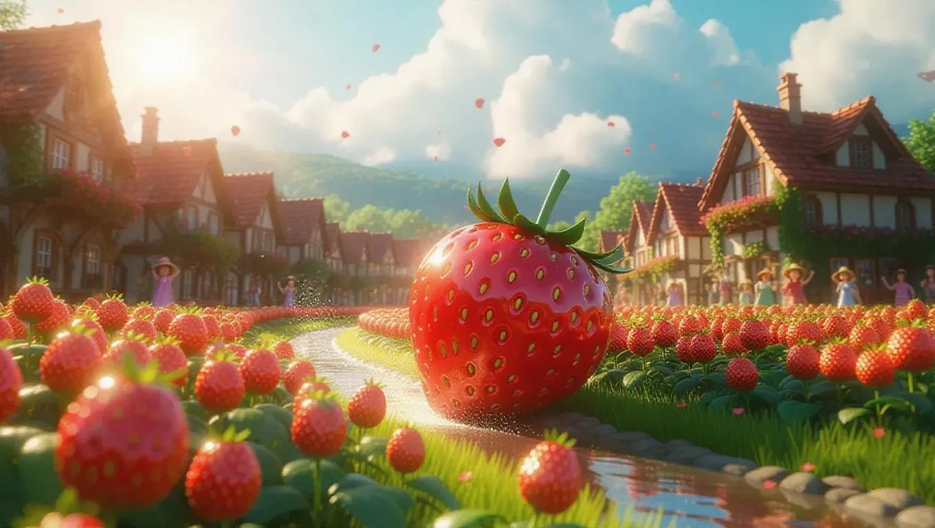 A delightful strawberry-shaped auto zipping through a vibrant village filled with blooming flower fields, trailing a magical stream of glistening berry dust, as radiant sunlight beams through soft-toned clouds and enthusiastic villagers wave from floral structures