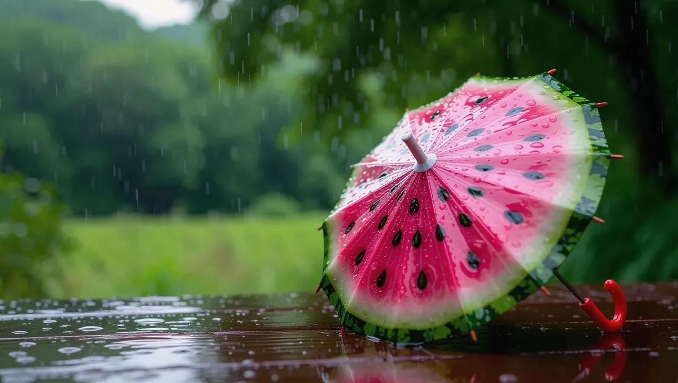 A charming umbrella shaped like a watermelon slice, open under a gentle drizzle, with droplets dancing off its vibrant pink and green surface, set against a charming countryside backdrop.