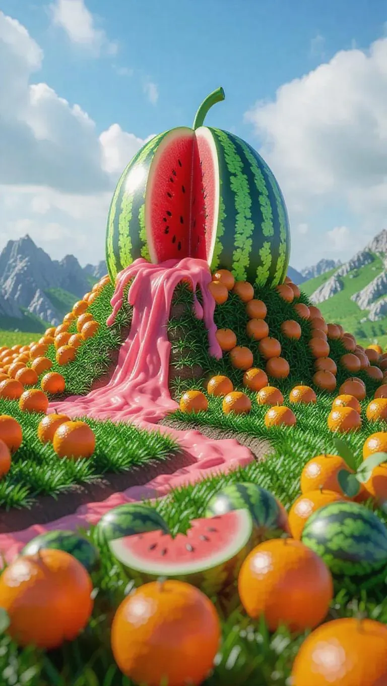 A mountain carved from a giant watermelon, with frothy watermelon shake cascading down its peak, surrounded by bright citrus orchards and melon fields.