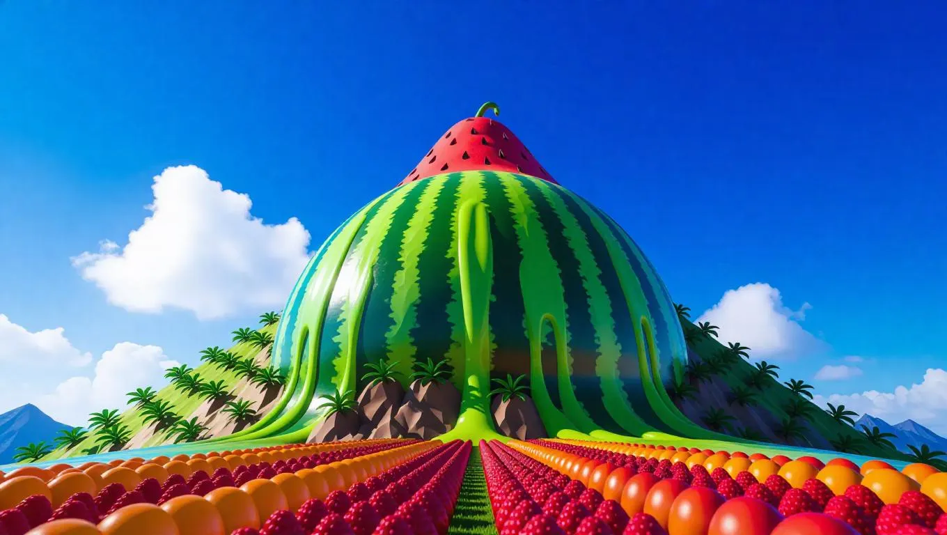 A mountain carved from a giant watermelon, with vibrant green juice cascading down its peak, surrounded by mango groves and berry fields.