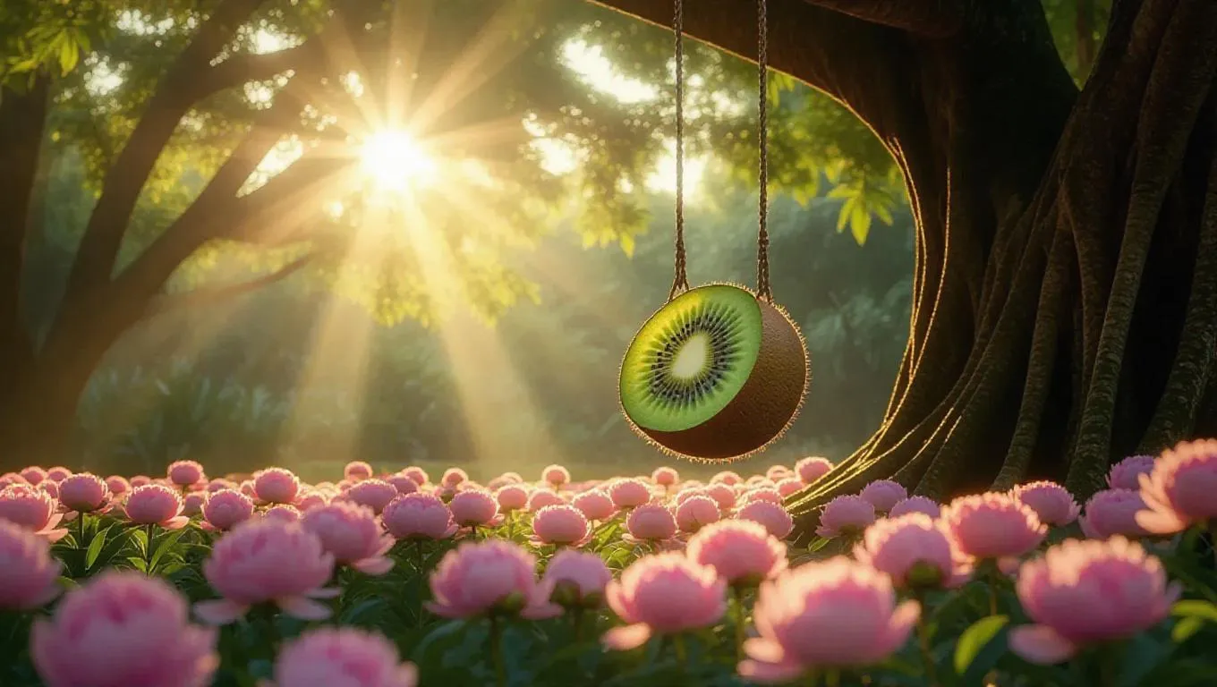 A whimsical half-kiwi-shaped swing hanging from a lush banyan tree, surrounded by a vibrant field of peonies in full bloom, creating a magical and serene atmosphere, with soft golden sunlight filtering through the branches, casting dappled shadows.