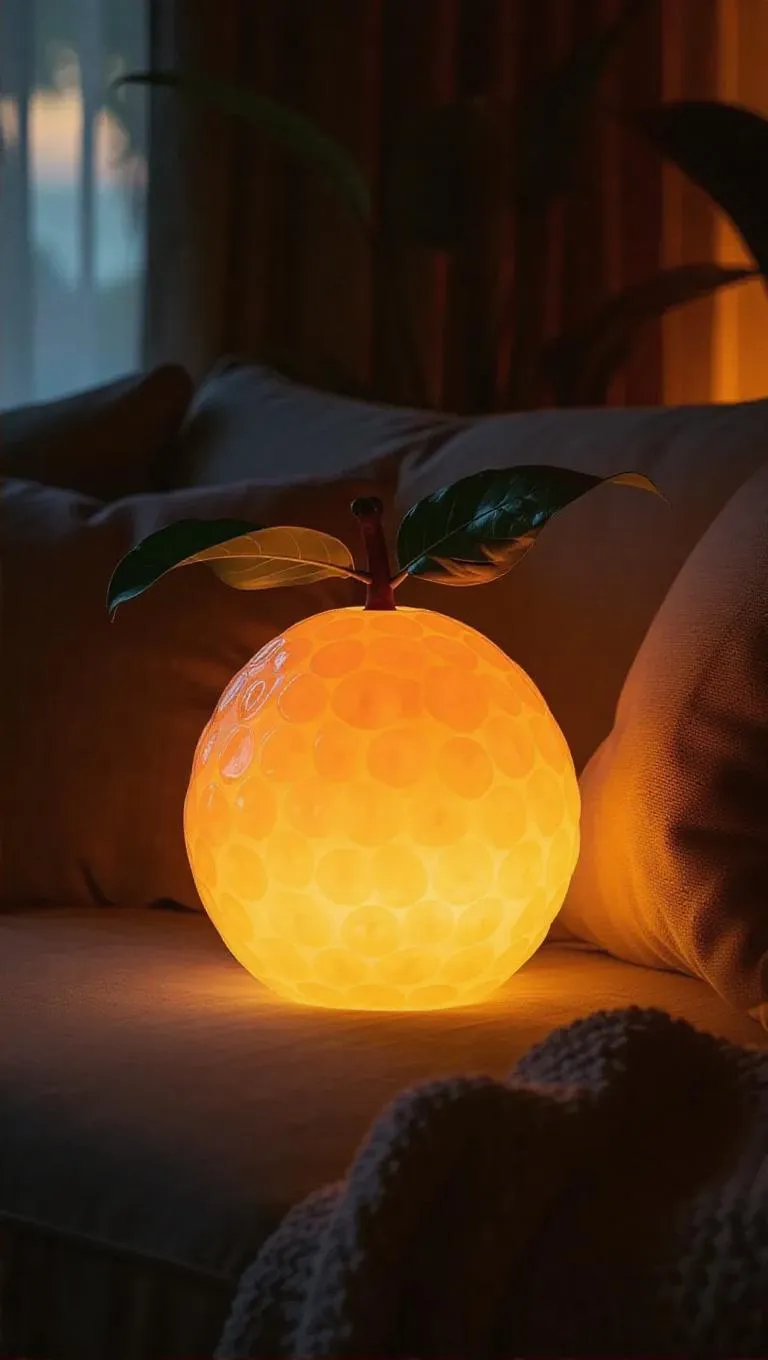 A whimsical lamp shaped like a glowing lychee, casting a warm, ambient light in a cozy corner, surrounded by plush cushions and no textiles, creating a serene and inviting atmosphere.