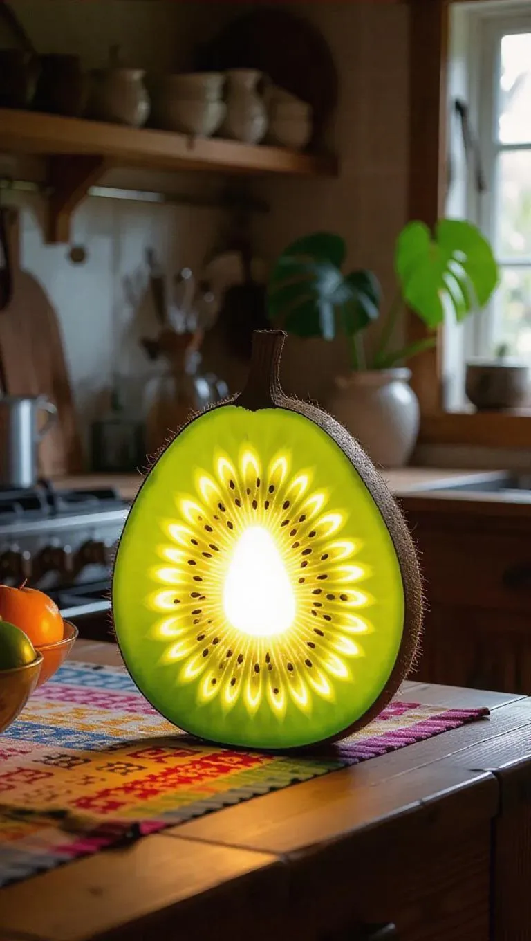 A whimsical lamp shaped like a glowing kiwi, casting a warm, ambient light in a rustic kitchen, surrounded by wooden countertops and colorful textiles, creating a cozy and inviting atmosphere.