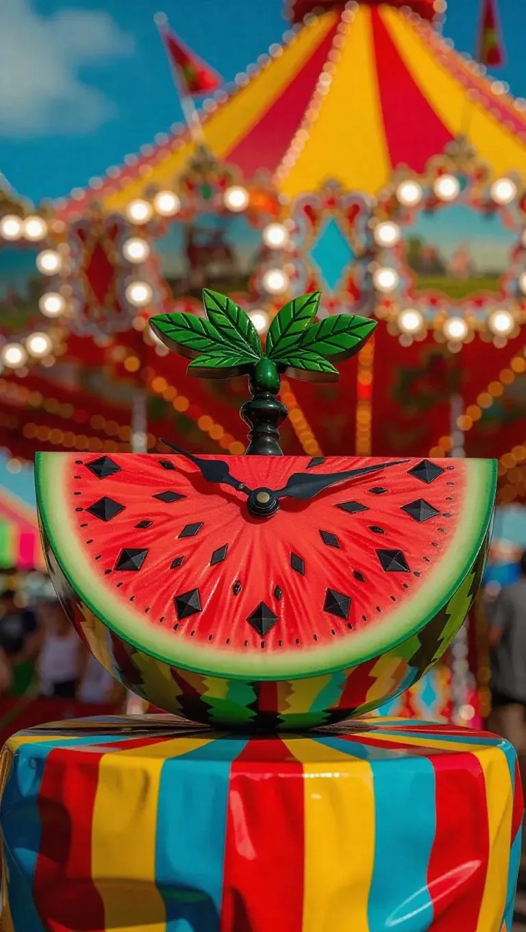 A whimsical clock shaped like a half watermelon, with diamond-shaped hour markers, resting on a lively carnival backdrop, exuding a fun and festive summer vibe.