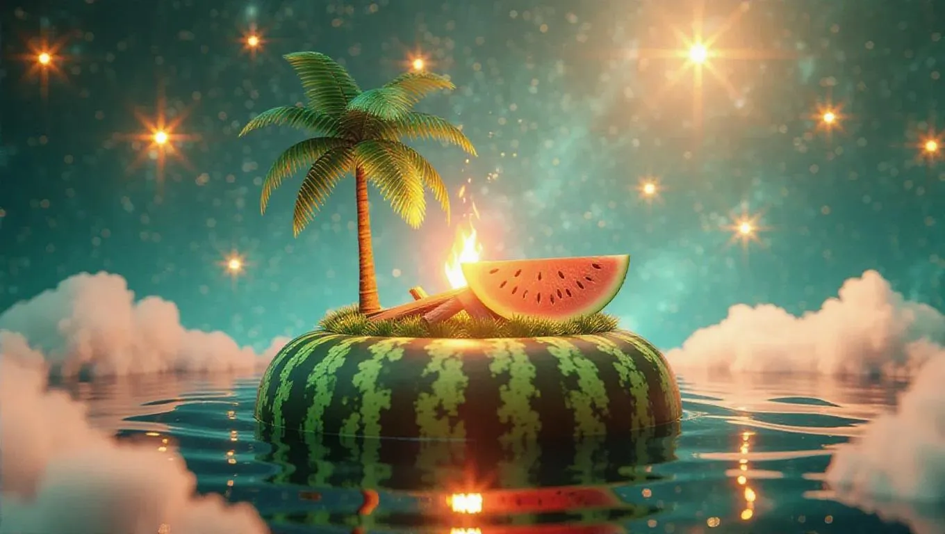 A whimsical watermelon island floating in a cosmic sea of bright comets, topped with a cozy campfire casting a warm, inviting glow, surrounded by a gentle aura of stardust and celestial light