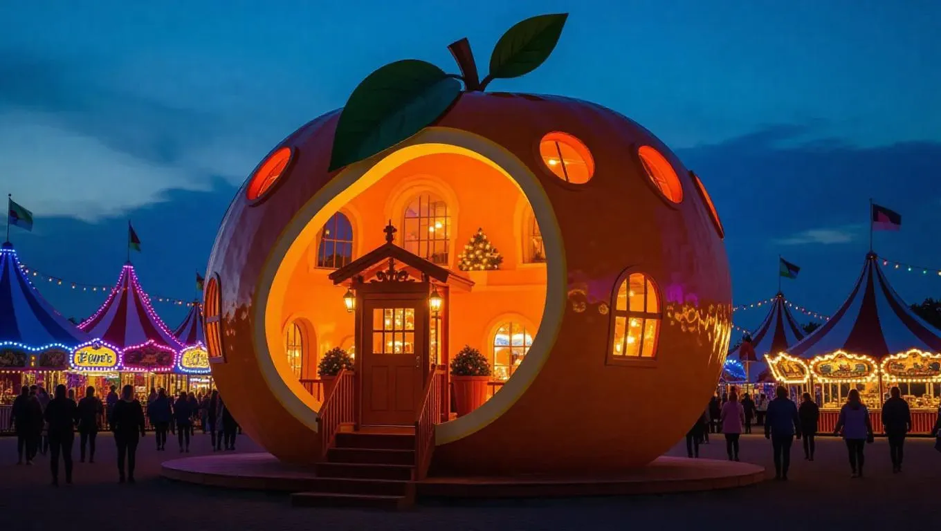 A whimsical house intricately carved from a giant orange, windows glowing warmly at night, surrounded by a bustling fairground, with colorful lights and laughter adding to the festive ambiance
