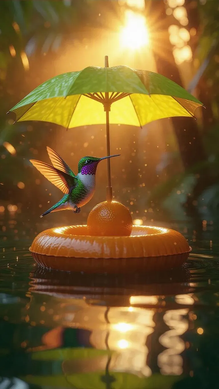 A hummingbird flits playfully under a bright lime umbrella on a whimsical floating tangerine raft, surrounded by sparkling, deep-green waters, with vibrant foliage and a warm sunset casting orange rays.