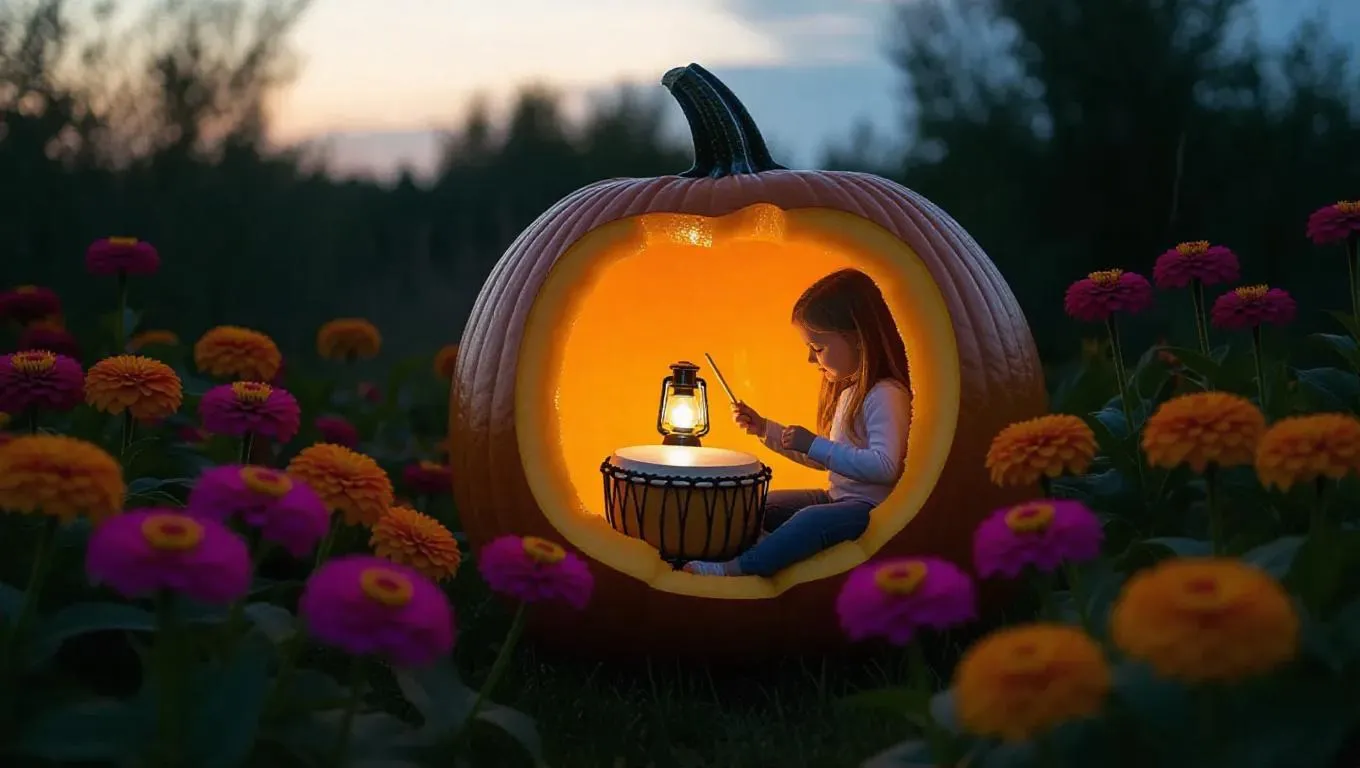A cozy cabin crafted from a halved squash, nestled among vibrant zinnia bushes. Inside, a girl plays with a toy drum, the warm glow of a small lantern casting a gentle light, creating a serene and enchanting atmosphere.