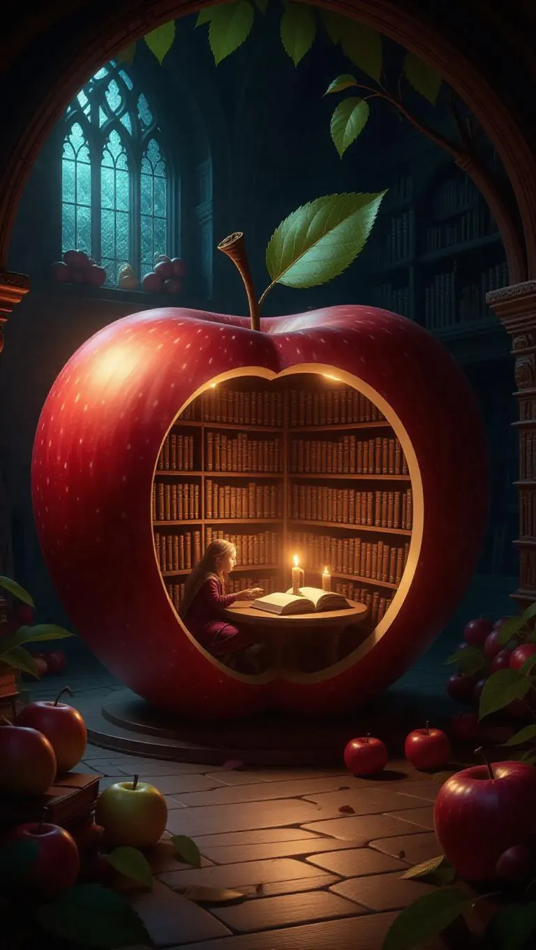 A mystical library nestled within a colossal apple core, illuminated by glowing fruit scrolls that emit an inviting light. Magical creatures sip nectar from the scrolls, creating a whimsical and enchanting atmosphere. The walls are adorned with magical runes and intricate carvings, enhancing the magical ambiance.