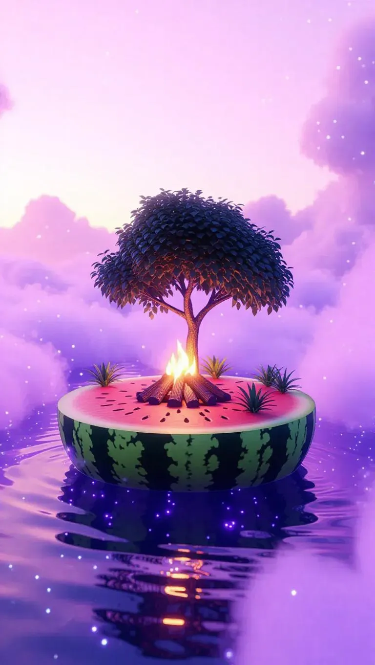 A whimsical watermelon island floating in a cosmic sea of soft lavender mist, topped with a cozy campfire casting a warm, inviting glow, surrounded by a gentle aura of stardust and celestial light
