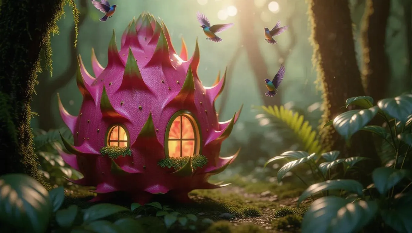 A dragonfruit-shaped cottage nestled in a forest, its vibrant pink exterior and green spikes contrasting against lush greenery, windows glowing softly as birds chirp nearby, creating a whimsical and enchanting scene.
