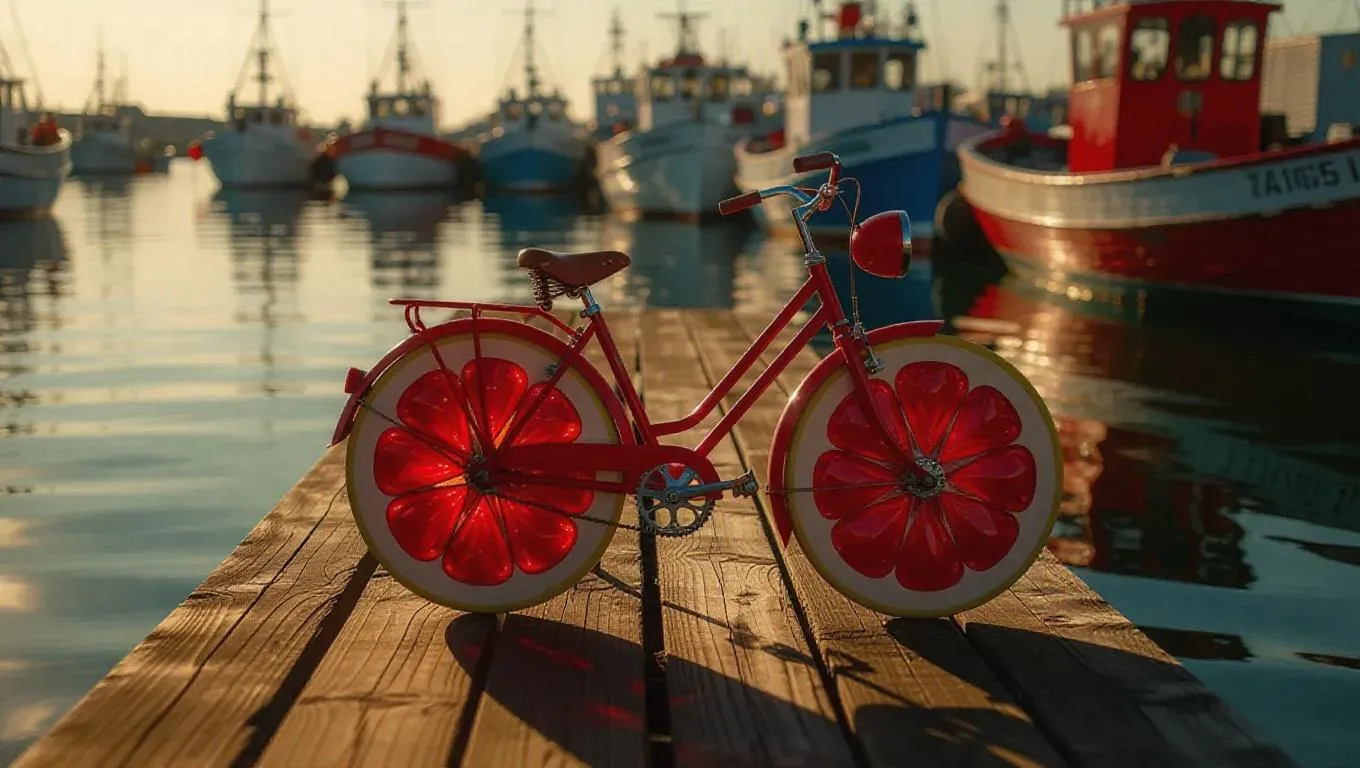 A whimsical bicycle with wheels shaped like juicy cherry slices, standing on a wooden pier, surrounded by fishing boats and fishermen, casting a playful shadow on the bleached wood, exuding a sense of summer joy and creativity.