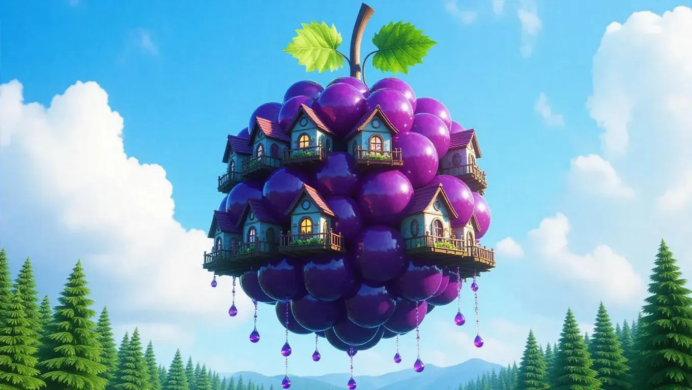 A whimsical floating library shaped like a giant grape, adorned with tiny jewel-shaped houses and rivers flowing with vibrant juice, suspended under a cerulean sky, with fluffy.