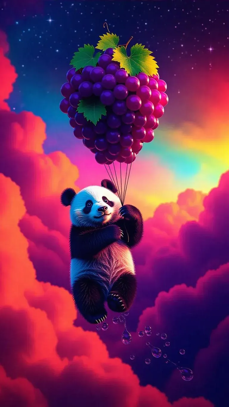 A playful panda piloting a whimsical balloon crafted from tangled grapes, soaring through vibrant rainbow clouds, with a trail of grape juice glistening in the starlight, creating a magical and surreal atmosphere.