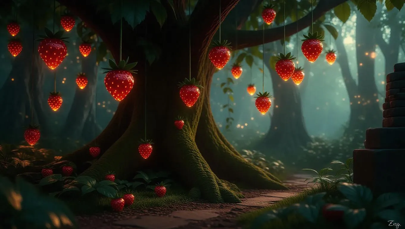 An enchanting world where trees grow upside-down, strawberries hanging like glowing lanterns, casting a soft, warm light. The forest holds ancient ruins, and the air is filled with a sense of mystery and adventure. Twinkling fireflies dance around the strawberry-lanterns, adding a magical touch to the scene.