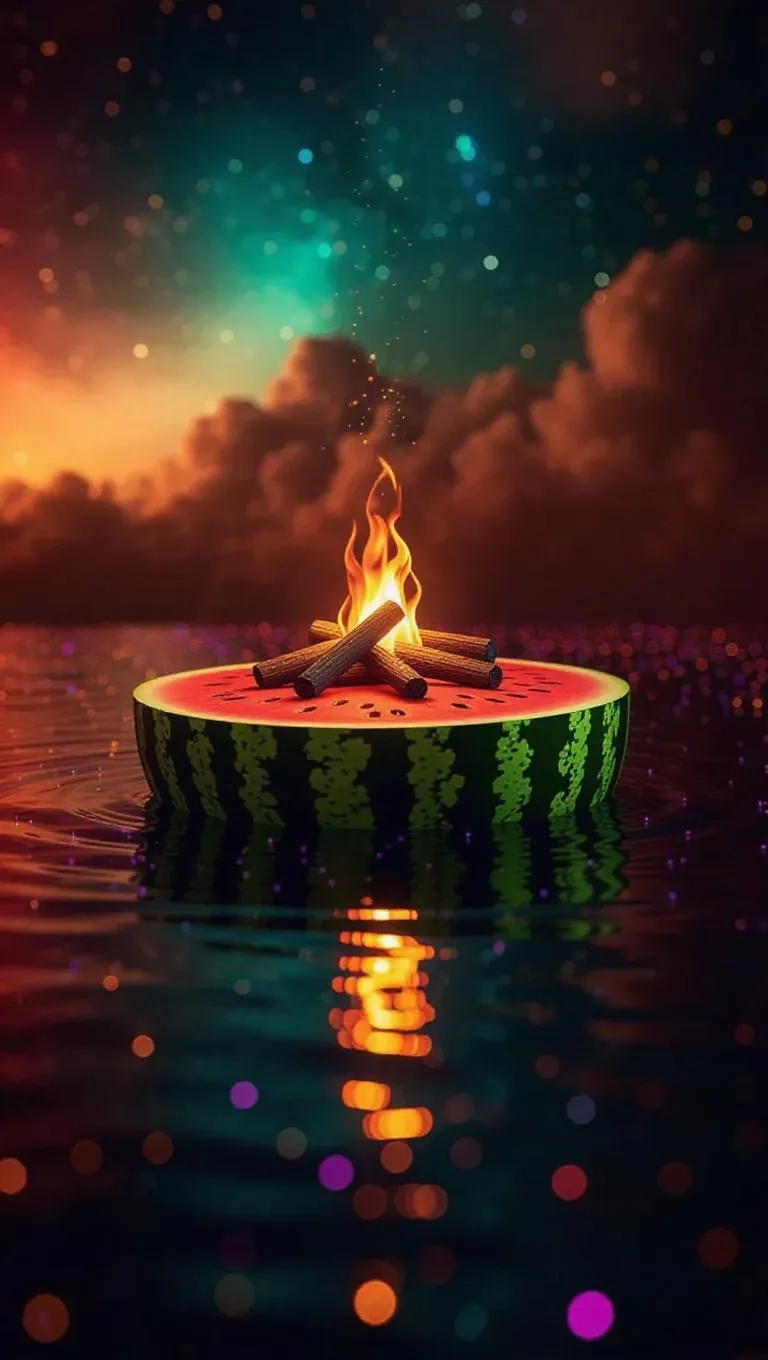 A whimsical watermelon island floating in a cosmic sea of multicolored lights, topped with a cozy campfire casting a warm, inviting glow, surrounded by a gentle aura of stardust and celestial light
