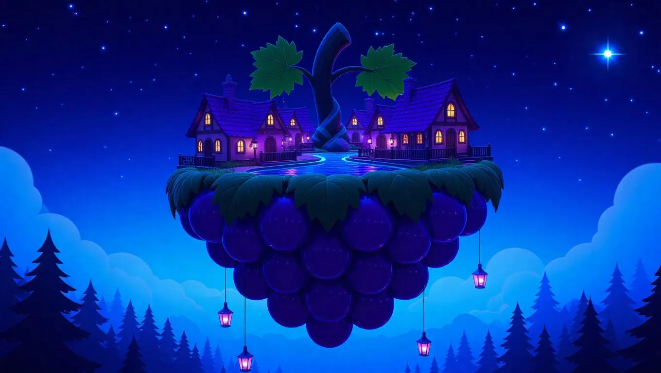 A magical floating island shaped like a giant grape, adorned with tiny lantern-shaped houses and rivers flowing with grape soda, suspended under a clear night sky, with bright stars and a gentle breeze