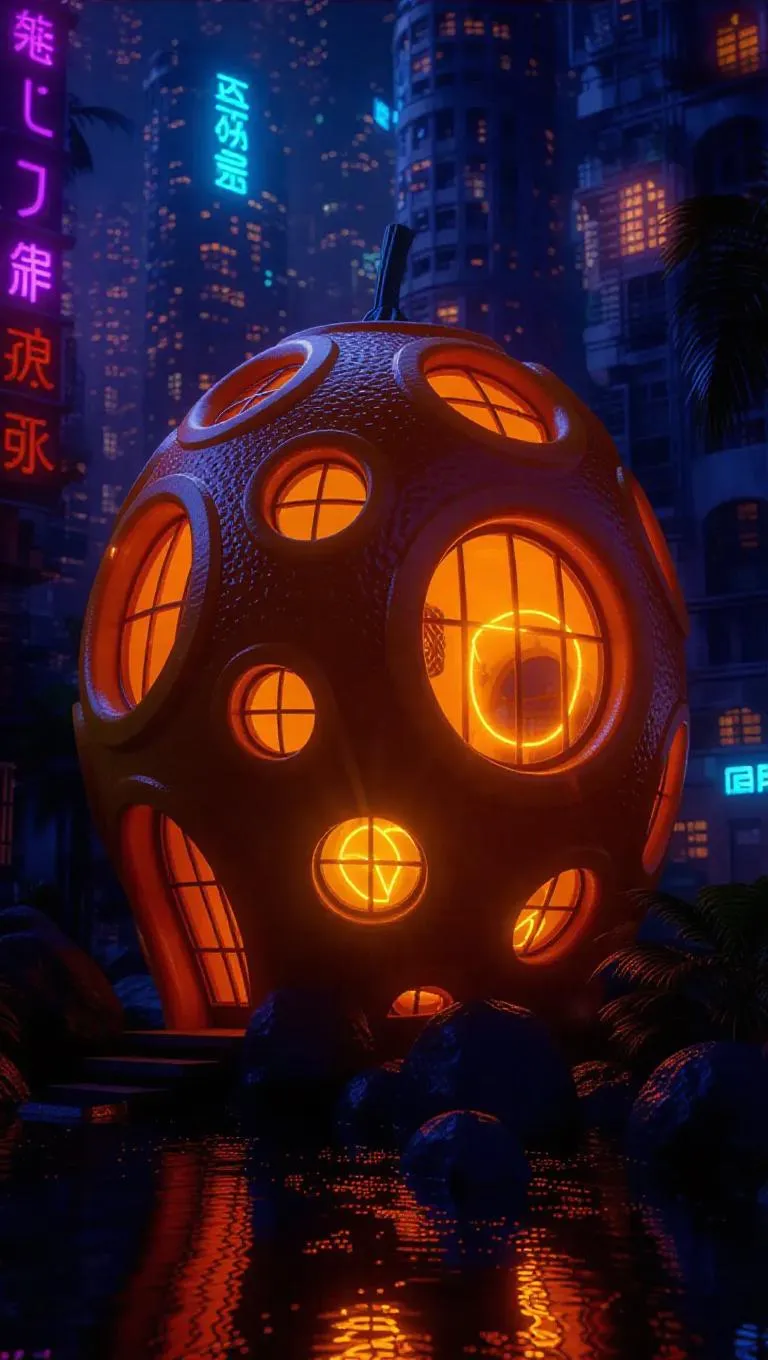 A whimsical house intricately carved from a giant orange, windows glowing warmly at night, surrounded by a futuristic cityscape, with neon lights and a pulsing energy adding to the vibrant ambiance