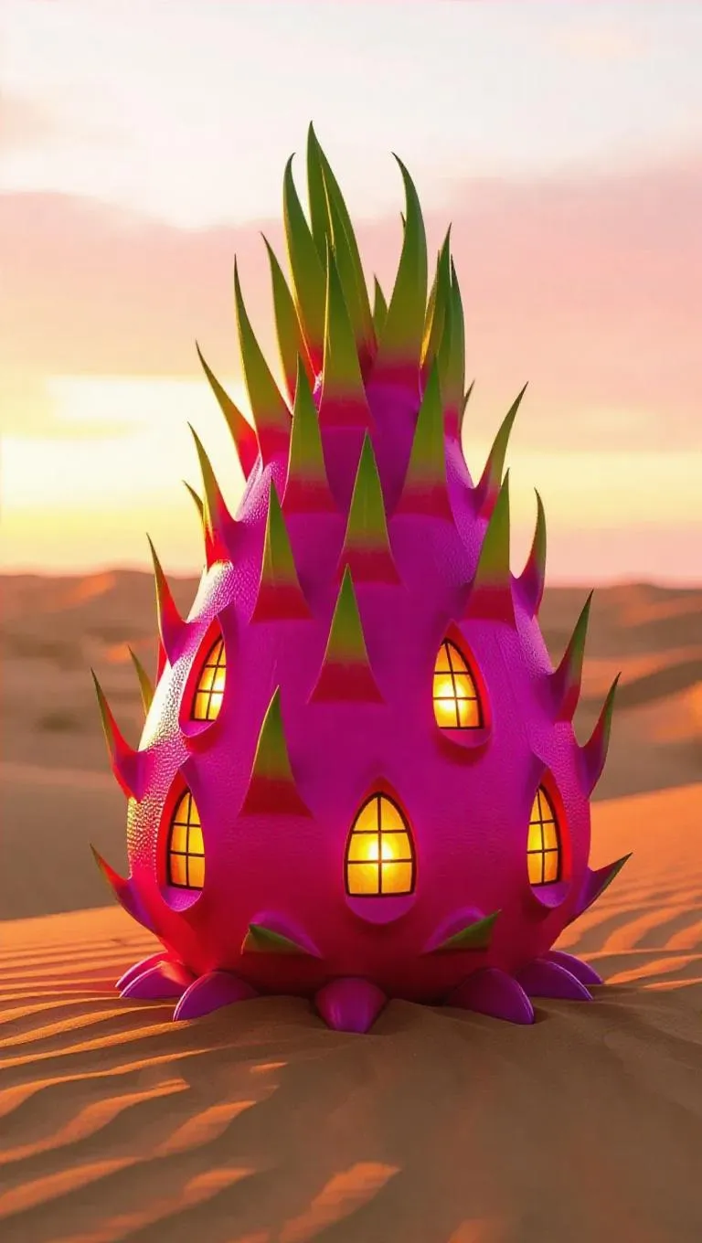 A dragonfruit-shaped palace on a desert dune, its vibrant pink exterior and green spikes contrasting against golden sand, windows glowing with warmth as the sun sets, creating a stunning and enchanting scene.