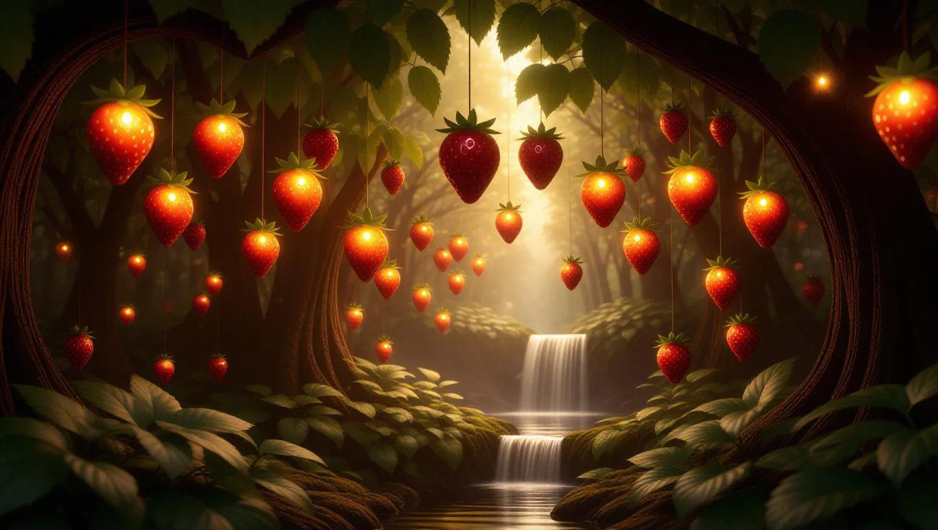 An enchanting world where trees grow upside-down, strawberries hanging like glowing lanterns, casting a soft, warm light. The forest is filled with gentle waterfalls, and the air is filled with a soothing, misty aroma. Twinkling fireflies dance around the strawberry-lanterns, adding a magical touch to the scene.