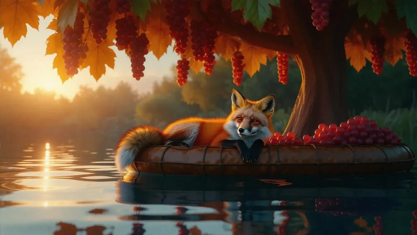 A fox lounges contentedly under a lush grapevine umbrella on a whimsical floating papaya raft, surrounded by serene, crystal-clear waters, with vibrant autumn foliage and a gentle sunset casting a warm, golden glow
