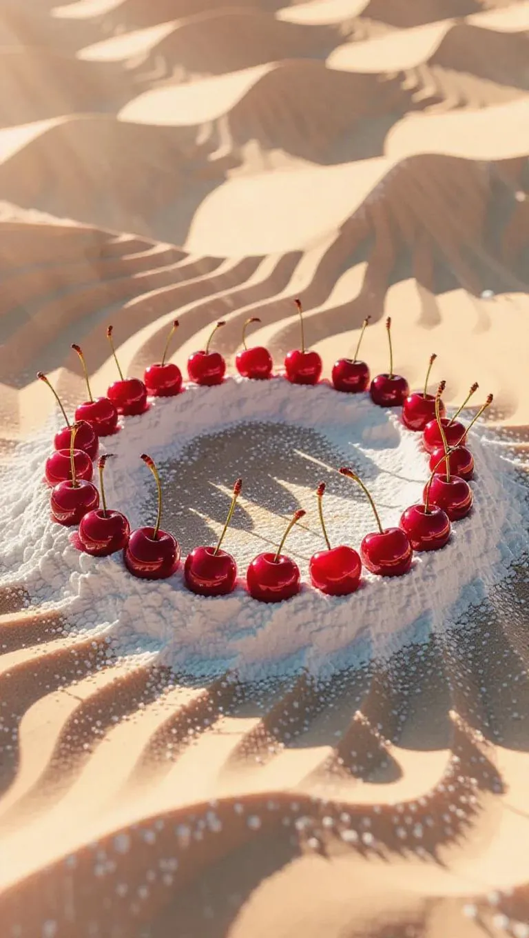 A whimsical desert of powdered sugar dunes, with a circle of stones adorned with vibrant red cherries, casting soft shadows in the golden hour light, creating a surreal and enchanting landscape