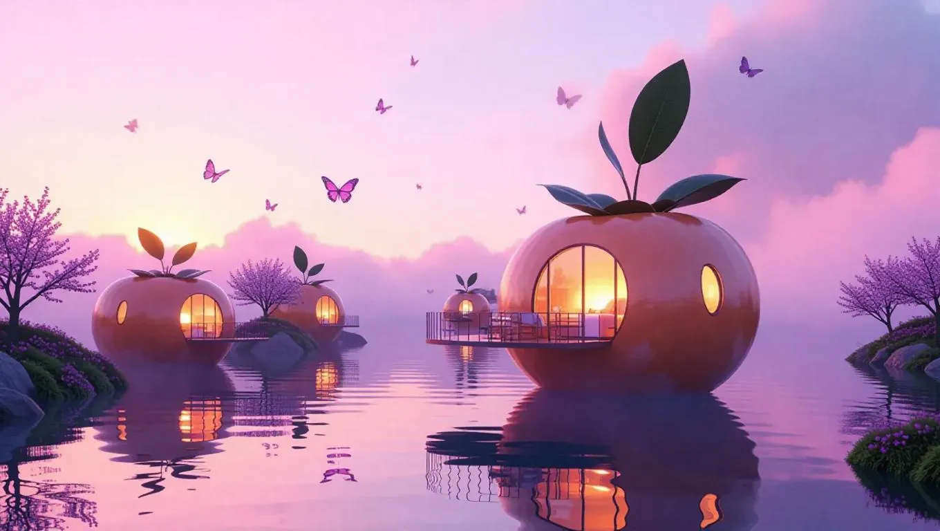 An eclectic floating terrain shaped like a giant persimmon, featuring tiny butterfly-shaped homes and waters flowing with fragrant juice, suspended under a pastel-toned sunset, with layers of color and a gentle touch of air.