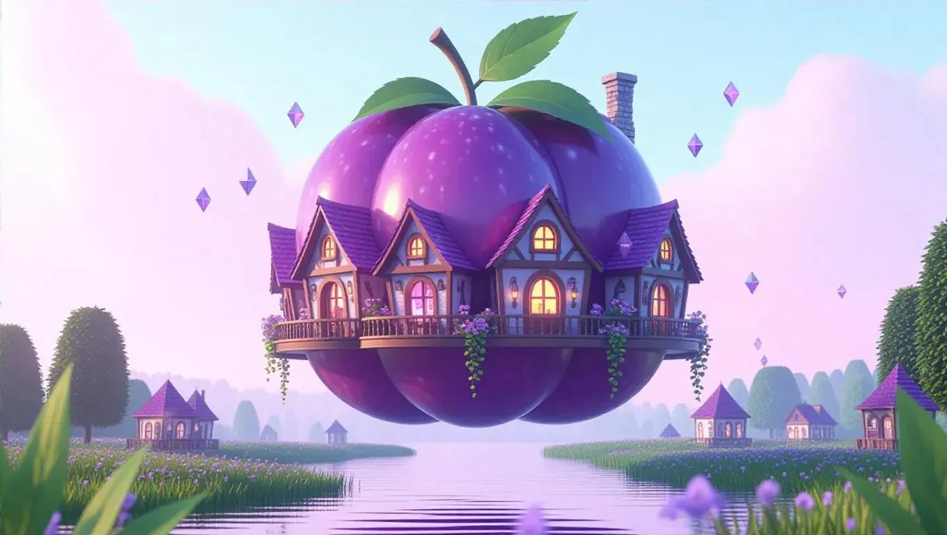 A whimsical floating library shaped like a giant plum, adorned with tiny diamond-shaped houses and rivers flowing with vibrant juice, suspended under a dreamy pastel sky, with fluffy.