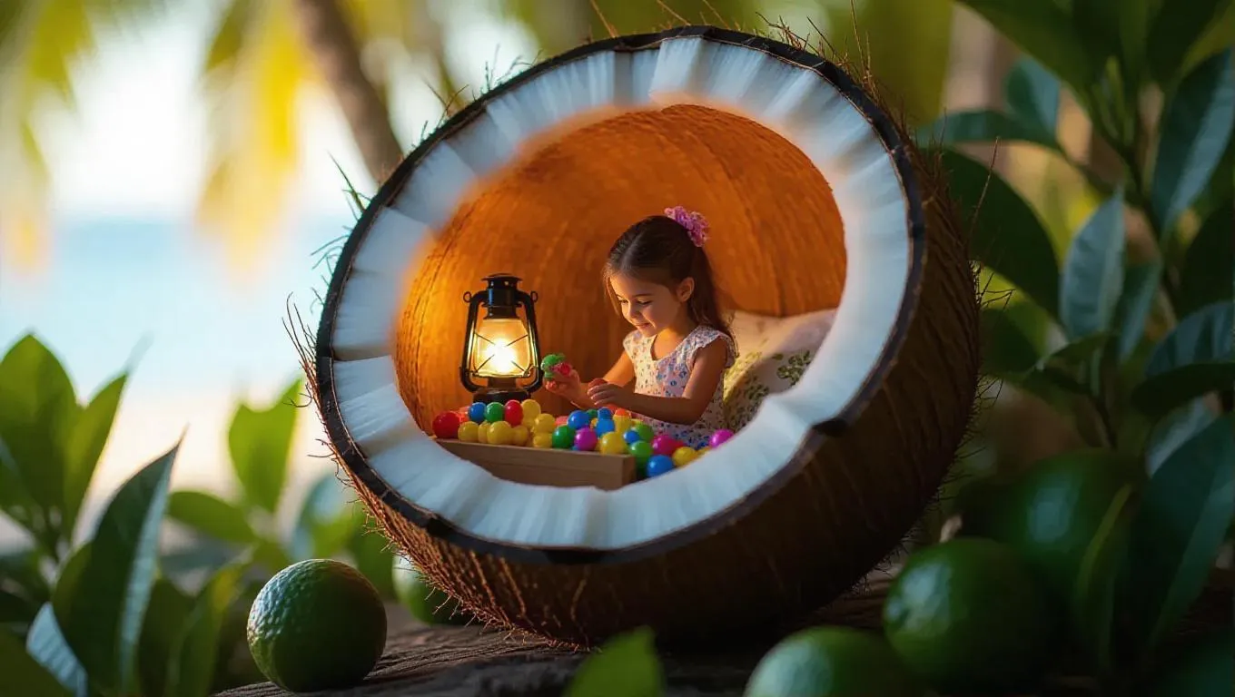 A cozy cabin crafted from a halved coconut, nestled among tropical lime trees. Inside, a girl plays with colorful toys, the warm glow of a small lantern casting a gentle light, creating a serene and enchanting atmosphere