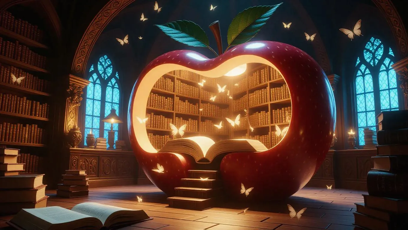 A mystical library nestled within a colossal apple core, illuminated by glowing dessert scrolls that emit a soft, ethereal light. Flying bookworms sip syrup from the scrolls, creating a whimsical and enchanting atmosphere. The walls are lined with culinary manuscripts and intricate carvings, enhancing the magical ambiance.