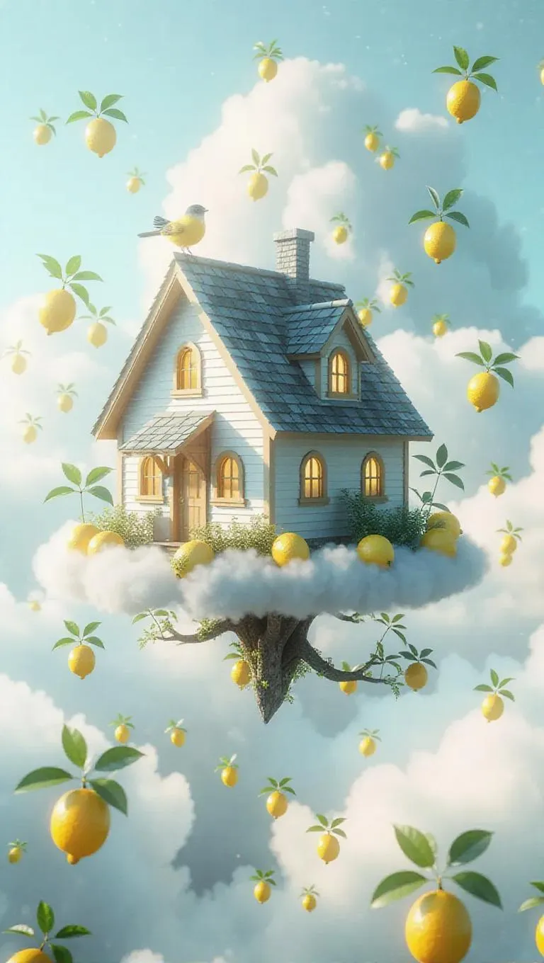 A tranquil cottage nestled in ethereal clouds, encircled by floating fruit rings and lemon birds serenading with gentle lullabies, creating a whimsical and serene atmosphere
