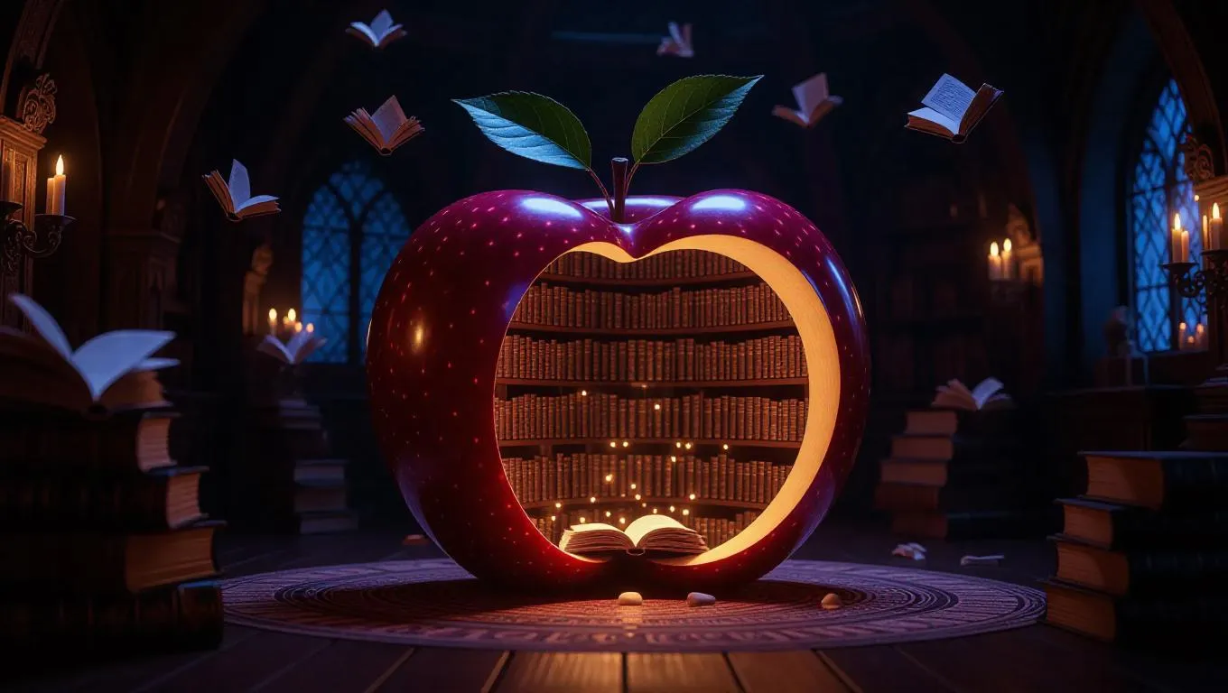 A mystical library housed within a colossal apple peel, illuminated by glowing fruit scrolls that emit a soft, ethereal light. Flying bookworms sip nectar from the scrolls, creating a whimsical and enchanting atmosphere. The walls are lined with ancient tomes and intricate carvings, enhancing the magical ambiance.