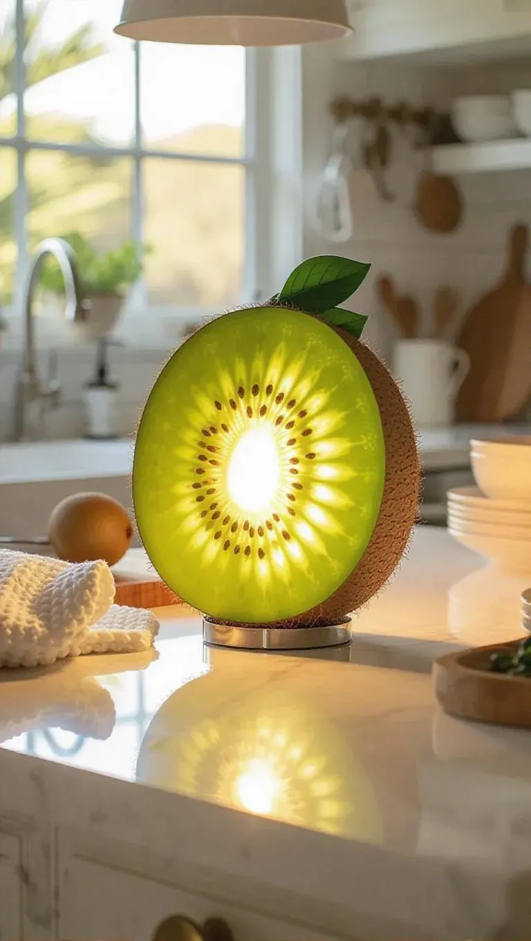 A whimsical lamp shaped like a glowing kiwi, casting a gentle, ambient light in a seaside kitchen, surrounded by light countertops and nautical textiles, creating a fresh and breezy atmosphere.