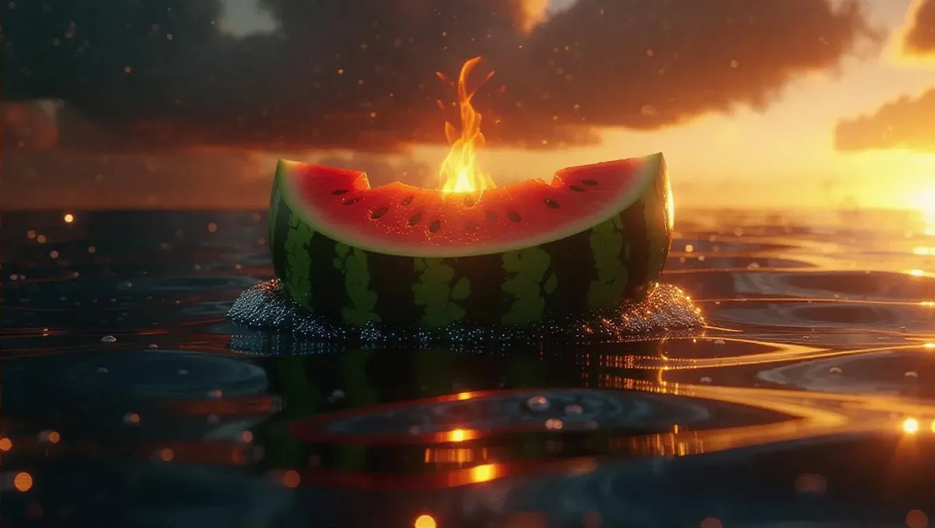 A whimsical watermelon island floating in a cosmic sea of glimmering silver waves, topped with a cozy campfire casting a warm, inviting glow, surrounded by a gentle aura of stardust and celestial light