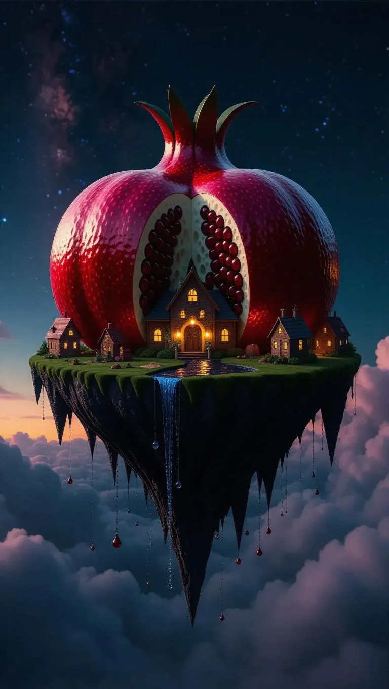 A curious floating island shaped like a giant pomegranate, adorned with tiny gem-shaped houses and rivers flowing with pomegranate juice, suspended under a twilight sky with glittering stars and a gentle breeze