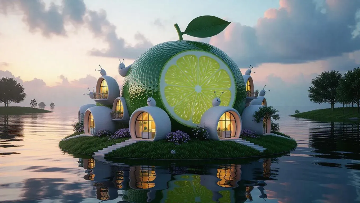 An original floating wonderland shaped like a giant lime, embellished with tiny snail-shaped houses and rivers flowing with zestful juice, suspended under a muted evening sky, with drifting clouds and a gentle gale.
