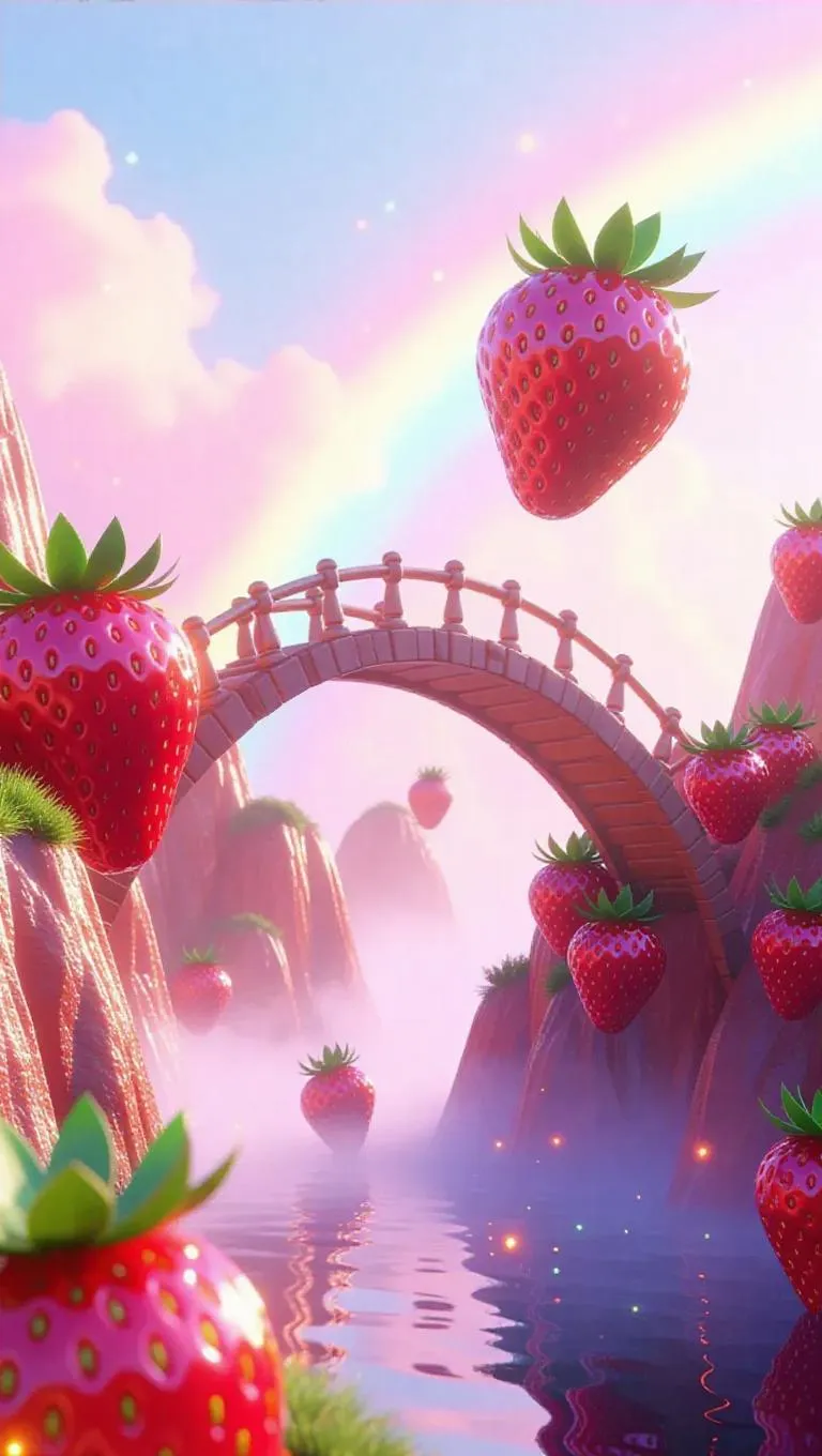 A whimsical bridge intricately woven from sparkling fruit leather, connecting two floating fruit islands adorned with plump, sweet strawberries. The islands hover above a misty, enchanted desert oasis, with a rainbow arching overhead and glowing fireflies dancing around the bridge.