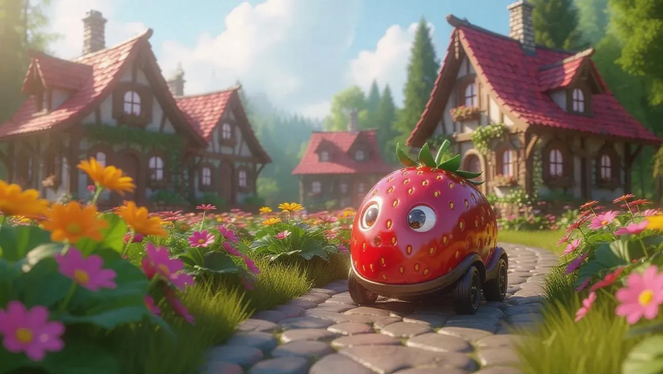 A quirky strawberry-shaped vehicle exploring a charming village full of colorful flower gardens, leaving behind a magical pathway of shining berry dust, as sunlight filters through soft clouds and cheerful villagers greet from their petal-shaped homes