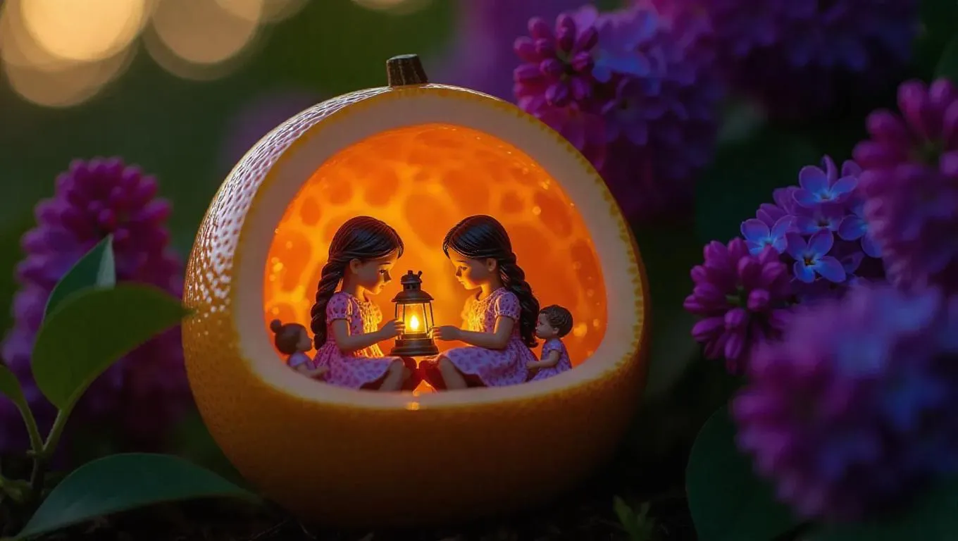 A cozy cabin crafted from a halved grapefruit, nestled among vibrant lilac bushes. Inside, a girl plays with miniature dolls, the warm glow of a small lantern casting a gentle light, creating a serene and enchanting atmosphere.