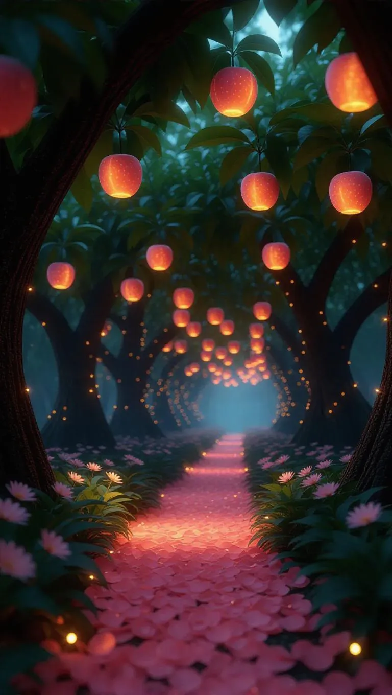 n enchanting world where trees grow upside-down, peaches hanging like glowing lanterns, casting a soft, warm light. The forest floor is carpeted with soft pink petals, and the air is filled with a sweet, floral aroma. Twinkling fireflies dance around the peach-lanterns, adding a magical touch to the scene.