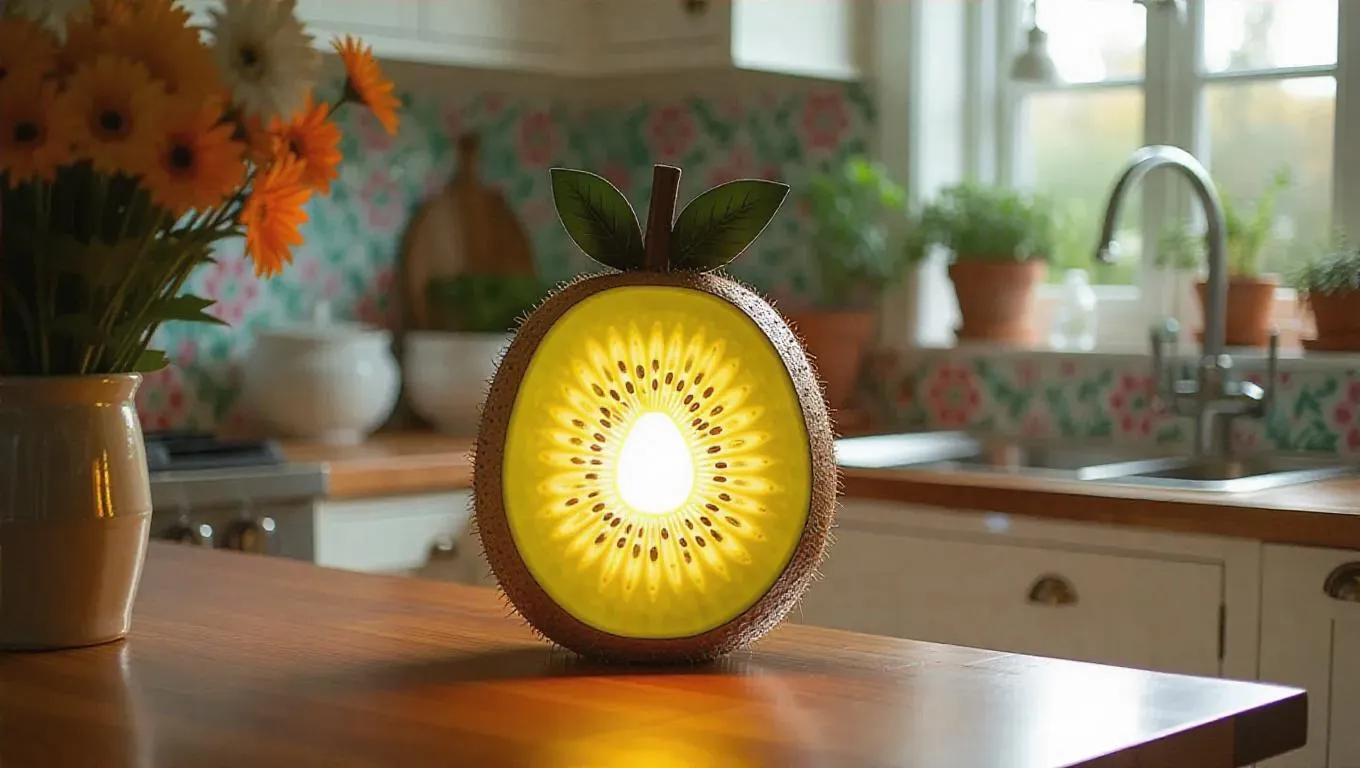 A whimsical lamp shaped like a glowing kiwi, casting a warm, ambient light in a bright kitchen, surrounded by cheerful countertops and floral textiles, creating a lively and cheerful atmosphere.