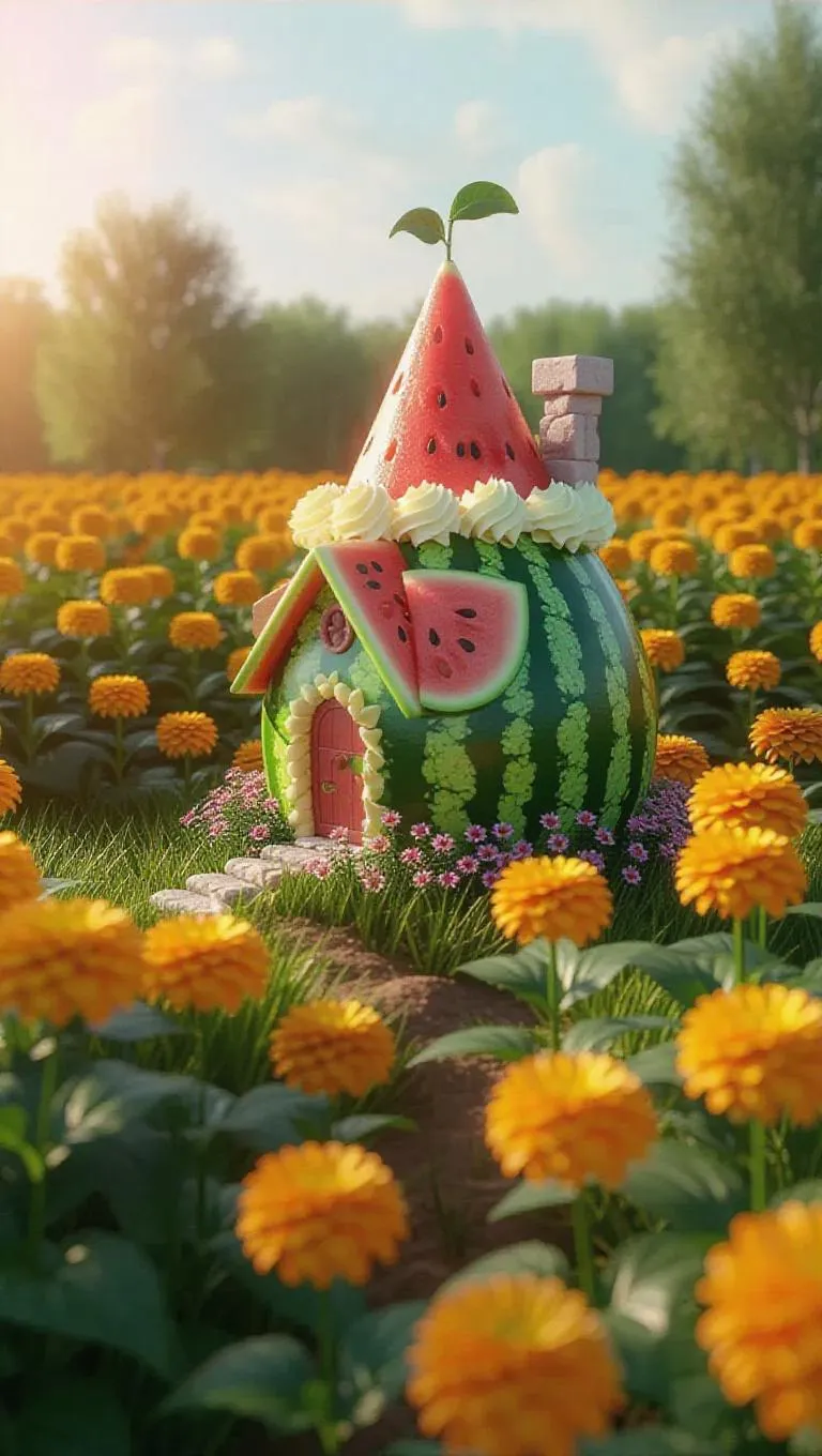 A whimsical little cottage crafted from plump watermelons and creamy frosting, nestled in the heart of a lush zinnia field, surrounded by a sea of vibrant yellow zinnias and delicate wildflowers, exuding a sweet, enchanting aroma under the bright light of a sunny day.