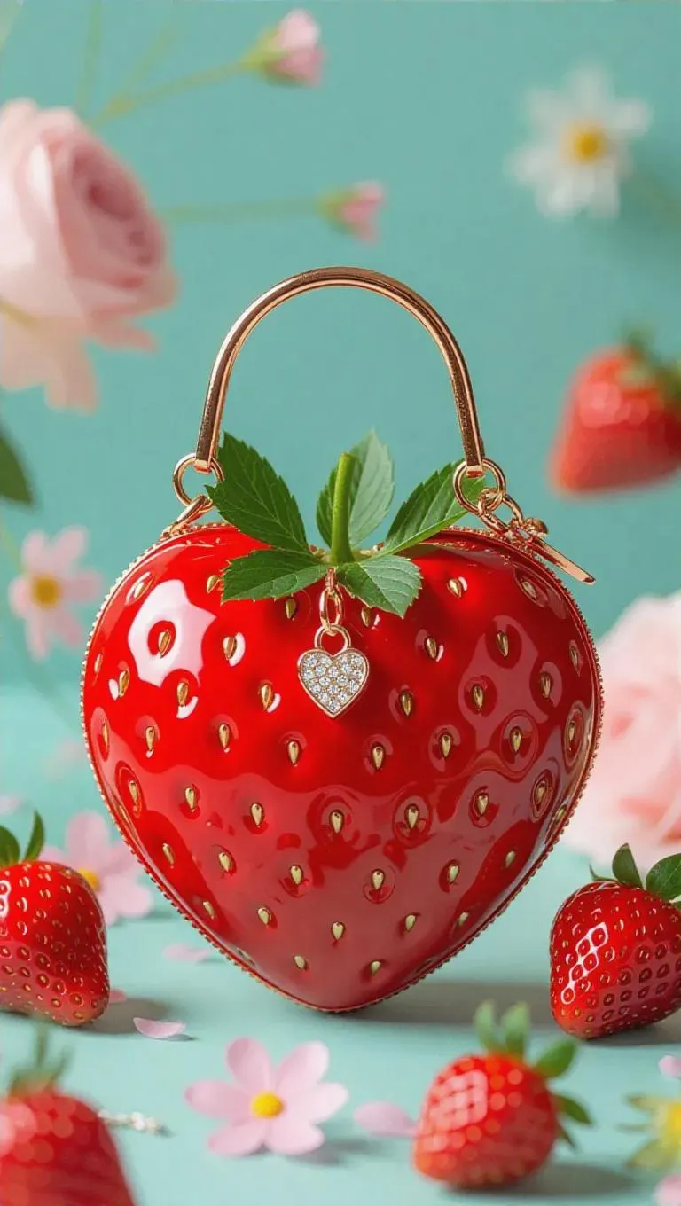 A heart-shaped strawberry handbag with rose gold zippers and a tiny charm bracelet, exuding a girly charm, set against a soft mint backdrop, with cute animal patterns and gentle, friendly lighting.