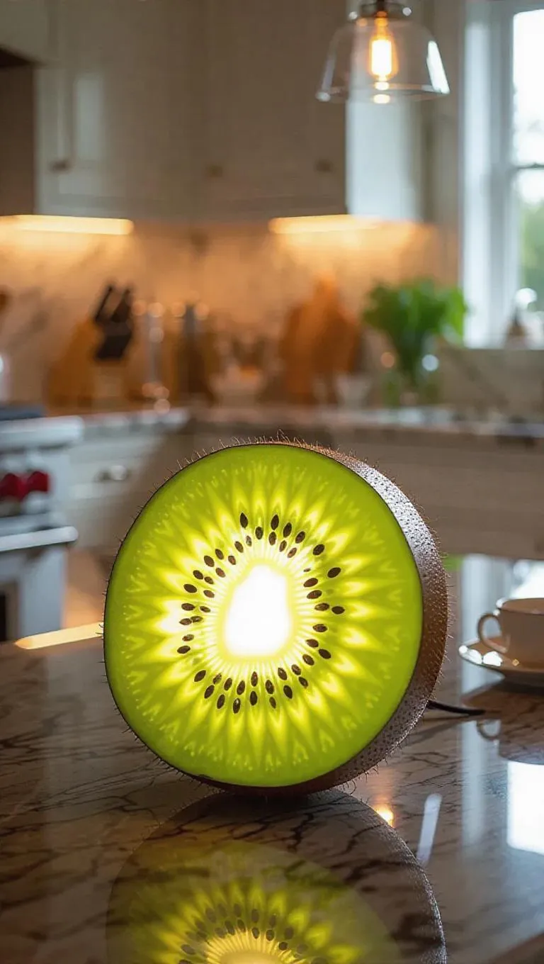A whimsical lamp shaped like a glowing kiwi, casting a warm, ambient light in a luxurious kitchen, surrounded by granite countertops and silk textiles, creating a lavish and opulent atmosphere.