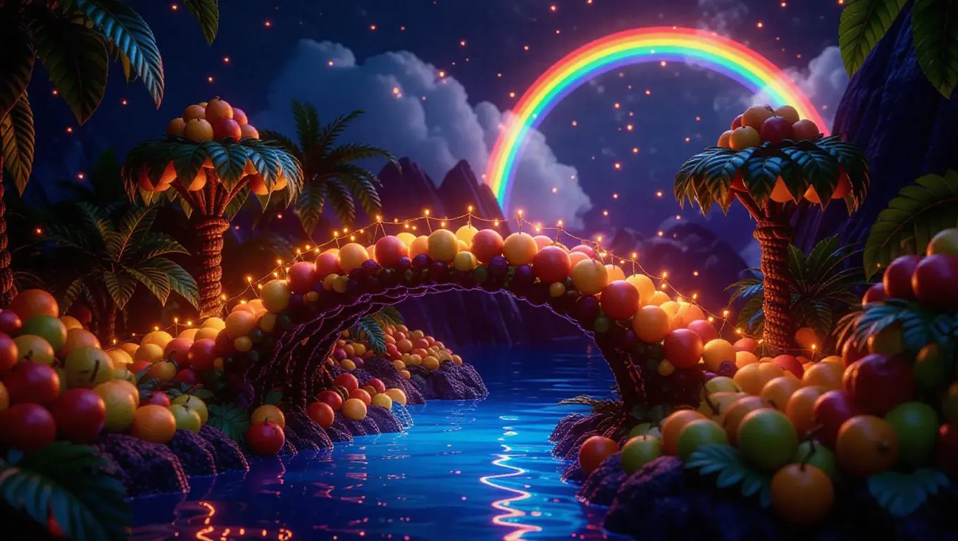 A whimsical bridge intricately woven from shimmering fruit skins, connecting two floating fruit islands adorned with abundant, colorful fruits. The islands hover above a vibrant, enchanted sea, with a rainbow arching overhead and glowing fireflies dancing around the bridge.